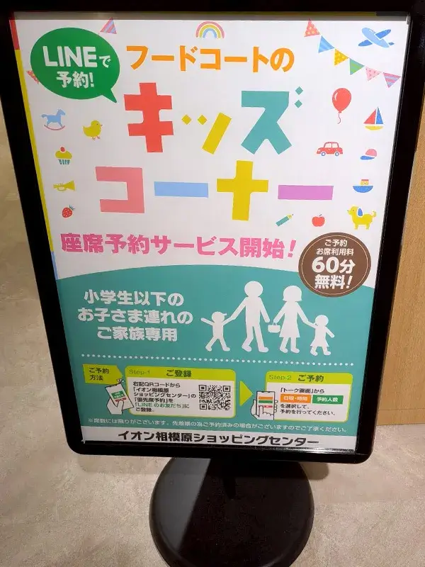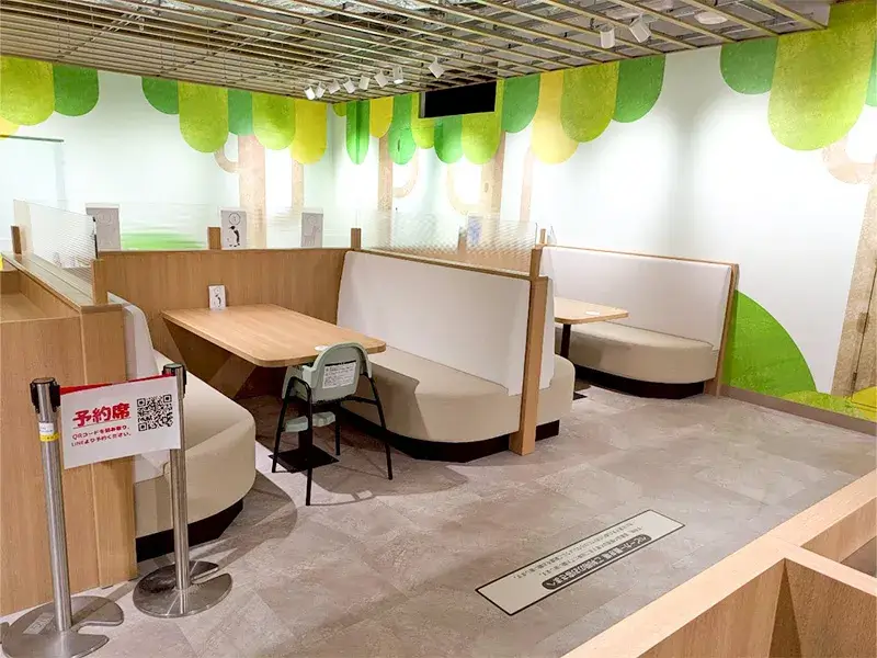 フードコートの一角にある座席は、当日のみLINE予約が可能。小学生以下の子ども連れ家族専用で、60分無料で利用できます。