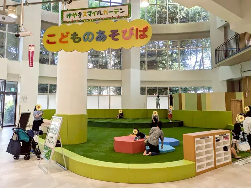 靴を脱いで上がる人工芝のようなやわらかいフロアには、子どもたちが夢中になる4つの遊具と落ち着いて過ごせる本コーナーがあり、無料で楽しめます。