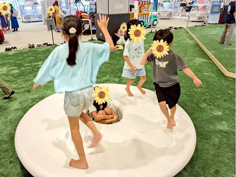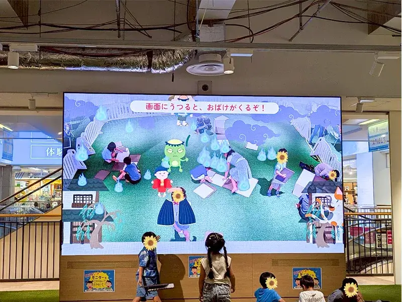 フードコート中心には、ベビーサークルで囲まれたキッズスペースがあり、モニターにはwebカメラを使ったゲームが映し出されていました。