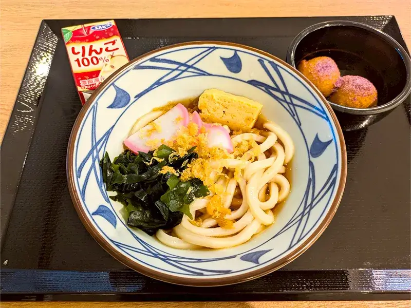 わが子は丸亀製麺のもちもちセットを注文。うどんは冷たいのと温かいのを選べるほか、ジュースと「うどーなつ」がついてきます。もちもちの「うどーなつ」が美味しすぎて、単品でおかわりを注文しました笑