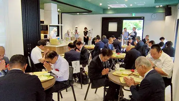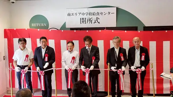 開所式には、町田市長、市議会議員、町内会の方々、運営会社の代表者などが集まり、この日を迎えるまでの苦労や子どもたちへの思いが語られました。その後、テープカットが行われ、温かい給食の試食会へ。参加者は皆で学校給食のように手を合わせて「いただきます」「ごちそうさま」を言い、学校給食を楽しみました。