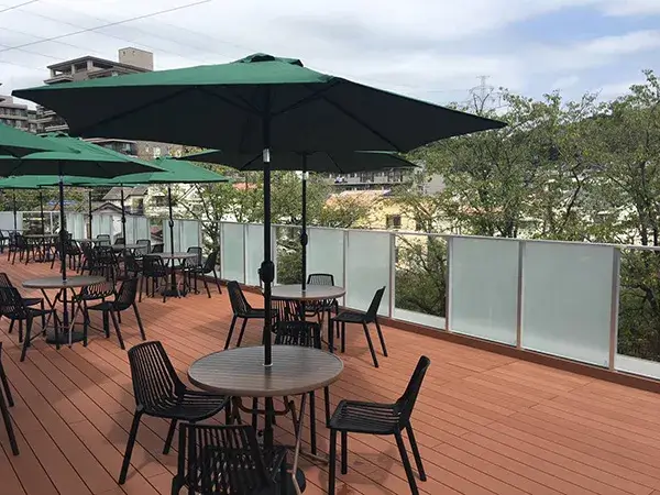 屋上のテラスでは、恩田川の景色を眺めながらゆったりと過ごせます。もちろんこちらでカフェメニューを楽しむこともできます。