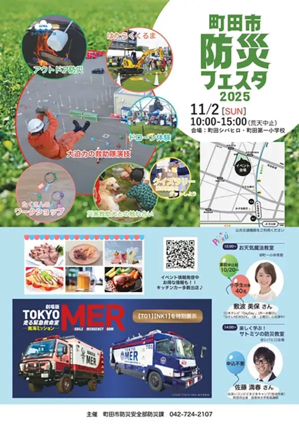 子どもから大人まで、楽しみながら防災について学べる体験型のイベント「町田市防災フェスタ2025」が開催されます。「町田シバヒロ会場」・「町一小校庭」・「町一小体育館」の3つの会場に分かれ、警視庁や消防署をはじめとした防災関係機関のほか、多くの民間事業者もブースを出展!「はたらくくるま」の展示や大迫力の救助隊演技、キッチンカーも登場し、家族みんなで一日中楽しめますよ♡
