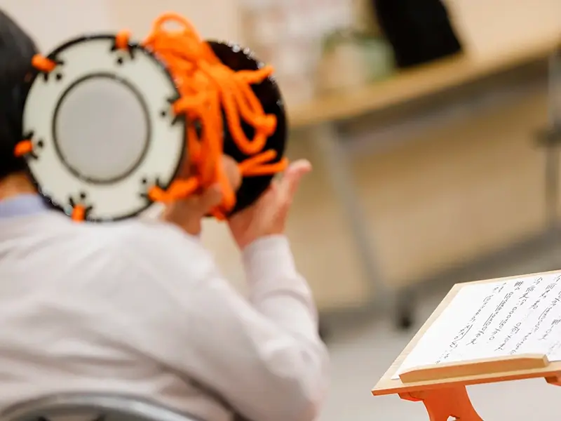 歌舞伎のお囃子の講師によるデモンストレーションやミニレクチャーの後、小鼓で《さくらさくら》を演奏してみよう。