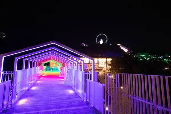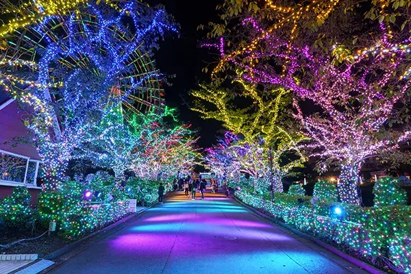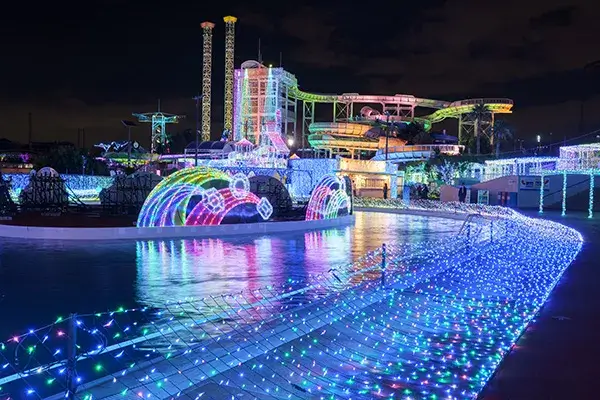 よみうりランドのイルミネーションは「ジュエリー」と「イルミネーション」を組み合わせた造語「ジュエルミネーション」という名前で2010年にスタートし、今年で16シーズン目となります。宝石のように輝くイルミネーションは関東最大級とされ、よみうりランド全体が華やかに彩られます。イルミネーションを見ながらアトラクションを楽しんだり、噴水ショーではシャボン玉や炎が出る演出もあり、家族で楽しめます♪
