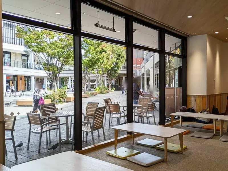 飲食スペースは、通常のテーブル席の他に、靴を脱いで利用する小上がりスペースや予約できる有料ボックス席もあり、子連れが利用しやすい造りになっています。