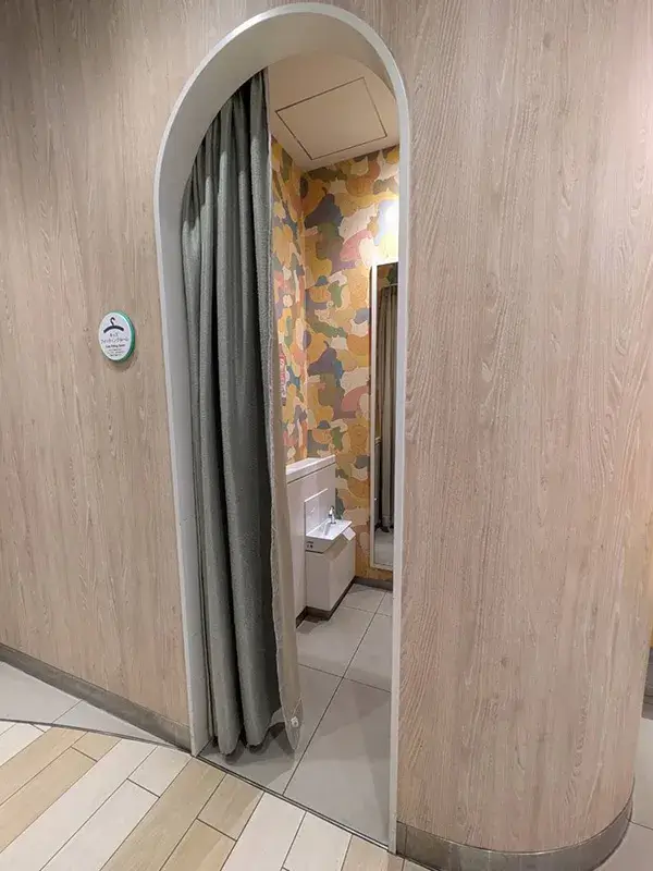 夏の時期、目の前にあるオアシスプラザの噴水「水のカーペット」で水遊びをする際には、着替えができるキッズフィッティングルームも便利です。