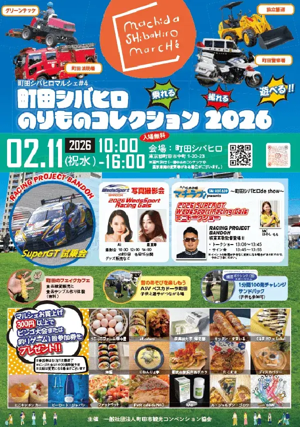 今回の町田シバヒロマルシェは、「乗れる!撮れる!遊べる!町田シバヒロのりものコレクション2026」。小野路にあるレーシングチームRACING PROJECT BANDOHや町田警察署、町田消防署などの協力のもと、働く車がシバヒロに集合します!