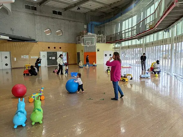遊んでいる子どもたちも広い体育館でおもちゃの車に乗り、走り回っていました。
