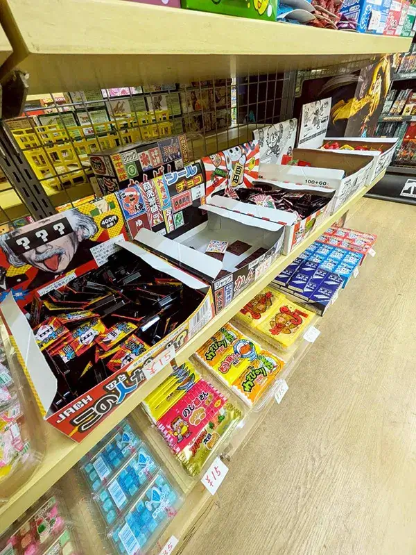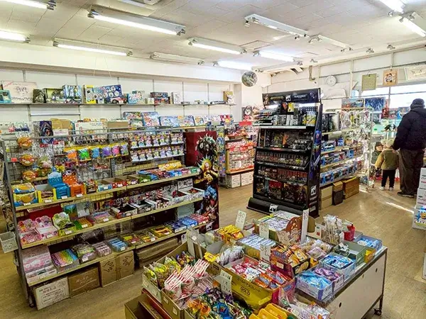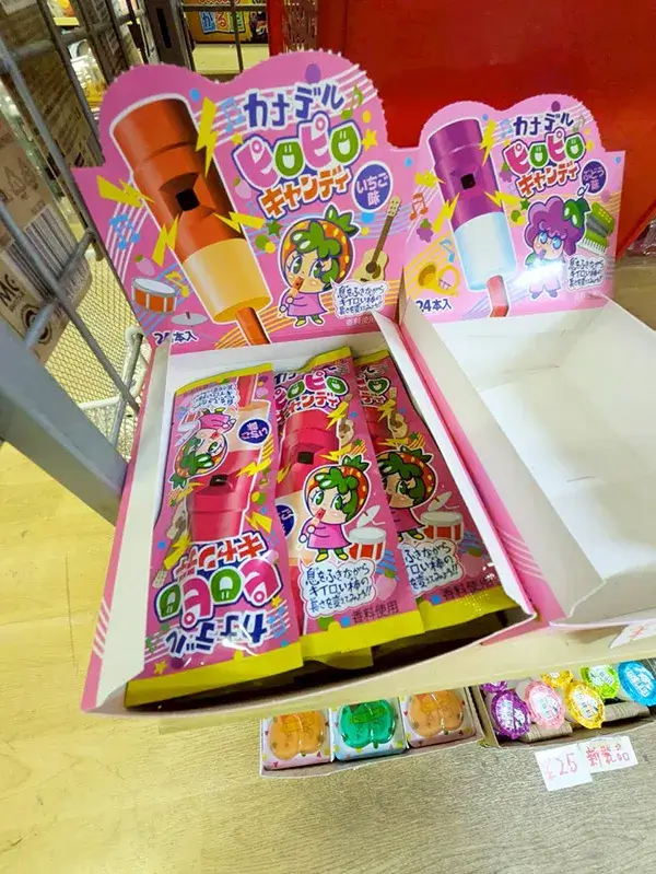 店内には、笛になるギミック付きのお菓子や、金券当たり付きの駄菓子がズラリ!もちろん子どもたちに大人気♪