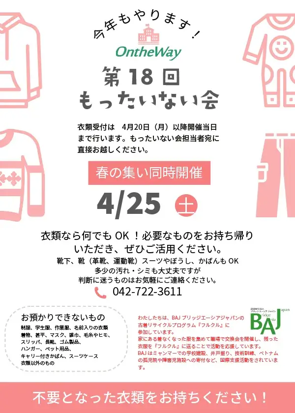 当日は、不要になった衣類を持ち寄る「もったいない会」も同時開催。まだ使える衣類を必要な方へつなぐ、環境にもやさしい取り組みです。