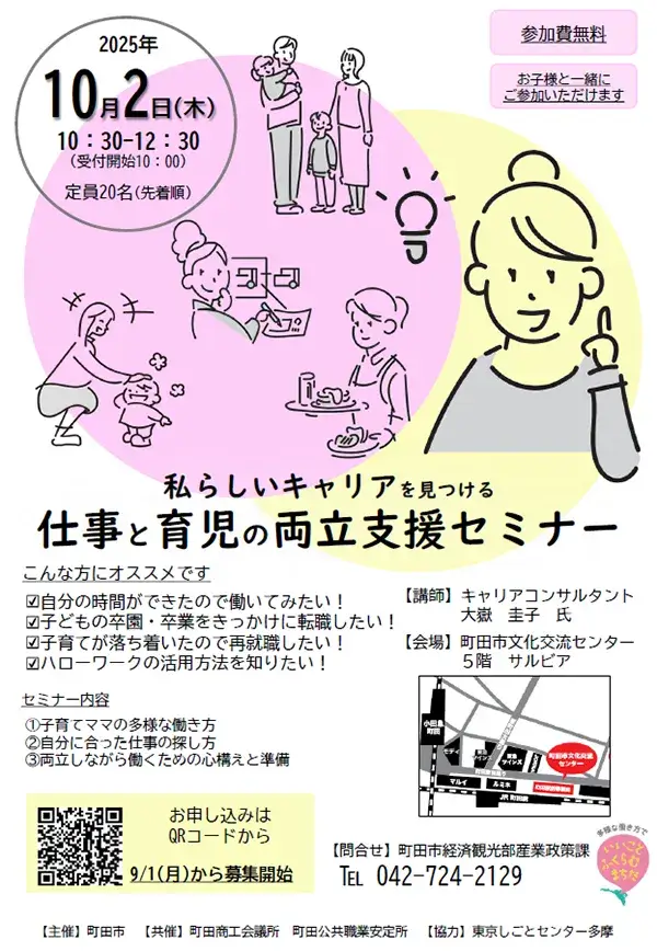 自分に合った仕事の探し方や、仕事と育児を両立しながら働くための準備について学ぶことができるセミナーです。