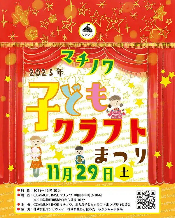 イベント情報 11/29(土) マチノワ子どもクラフトまつり2025 2025/09/28 2025/11/03 らぶふぁみ事務局 開催日: 2025/11/29 10:00 - 16:30カテゴリー: イベント情報 今年も中町3丁目のマチノワで開催決定!「マチノワ子どもクラフトまつり2025」。色々なワークショップ、豚汁やわたがしの販売もありますよ! 開催日時:2025年11月29日(土)10:00-16:30 会場:COMMUNE BASEマチノワ(町田市中町3-10-6)アクセス:小田急線「町田駅」より徒歩10分 / JR横浜線「町田駅」より徒歩13分駐車場:なし主催:COMMUNE BASE マチノワ、まちだ子どもクラフトまつり実行委員会