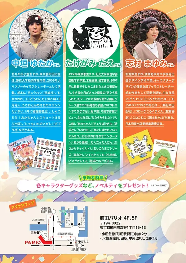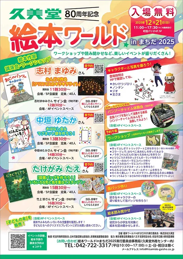 イベント情報 12/21(日) 久美堂80周年 絵本ワールドinまちだ2025 2025/11/28 2025/12/07 らぶふぁみ事務局 開催日: 2025/12/21 11:00 - 17:30カテゴリー: イベント情報 絵本作家による講演会やワークショップ、読み聞かせなど、楽しいイベントが盛りだくさん! 開催日時:2025年12月21日(日) 11:00-17:30(16:30最終受付)会場:町田パリオ 4F・5F(町田市森野1-15-13)入場:無料アクセス:小田急線「町田駅」から徒歩1分 / JR横浜線「町田駅」から徒歩2分 駐車場:なし