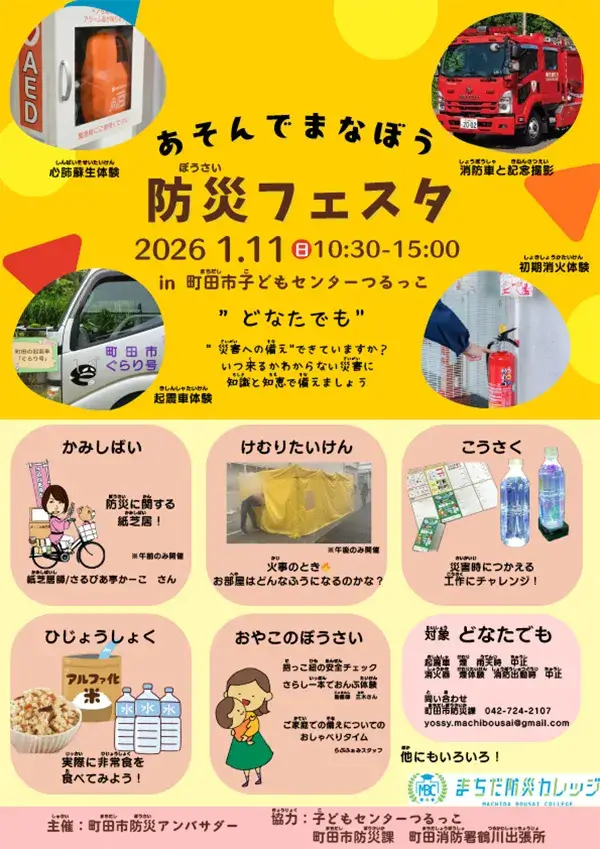 イベント情報 1/11(日) あそんでまなぼう 防災フェスタin町田市子どもセンターつるっこ 2025/12/28 2026/01/06 らぶふぁみ事務局 開催日: 2026/01/11 10:30 - 15:00カテゴリー: イベント情報 町田市防災アンバサダーが企画!防災すごろくや防災クイズラリー、防災時に使える工作や起震車などの体験コーナー等、どなたでも参加でき、遊びながら学べるイベントです。 開催日時:2026年1月11日(日) 10:30-15:00 開催場所:町田市子どもセンターつるっこ(町田市大蔵町1913)アクセス:神奈中バス「鶴川市民センター入口」下車徒歩4分・「消防署前下車」下車徒歩3分・「センター前」下車徒歩7分駐車場:あり