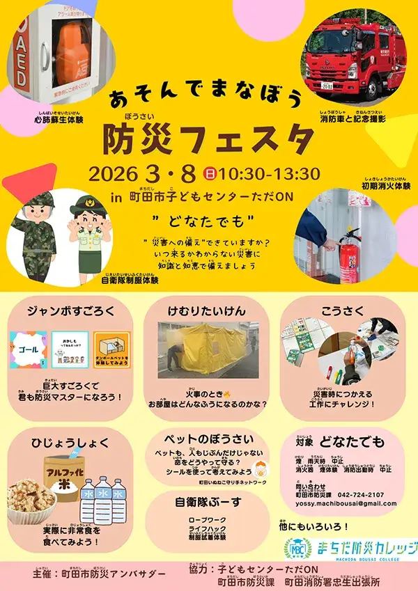 イベント情報 3/8(日) あそんでまなぼう 防災フェスタin町田市子どもセンターただON 2026/02/27 2026/03/06 らぶふぁみ事務局 開催日: 2026/03/08 10:30 - 13:30カテゴリー: イベント情報 町田市防災アンバサダーが企画!防災すごろくや防災クイズラリー、防災時に使える工作やけむり体験等、どなたでも参加でき、遊びながら学べるイベントです。 開催日時:2026年3月8日(日) 10:30-13:30 開催場所:町田市子どもセンターただON(町田市忠生1-11-1)アクセス:神奈中バス「忠生公園前」下車徒歩3分または「忠生公園入口」下車徒歩7分駐車場:あり
