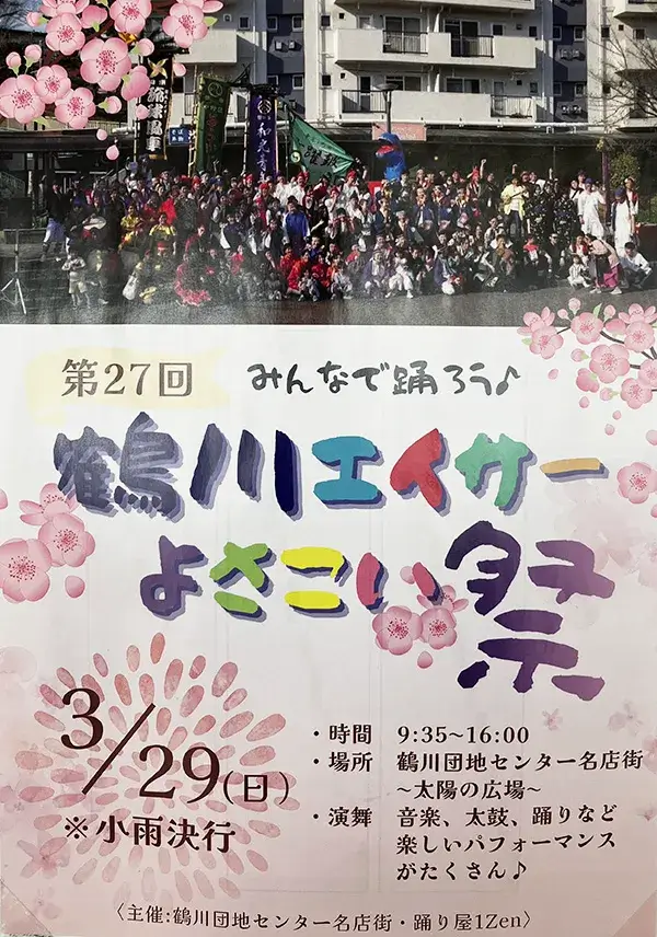 イベント情報 3/29(日) 第27回みんなで踊ろう♪鶴川エイサーよさこい祭 2026/02/27 2026/03/06 らぶふぁみ事務局 開催日: 2026/03/29 09:35 - 16:00カテゴリー: イベント情報 たくさんのエイサー団体が参加!ステージでのパフォーマンスやパレード演舞もありますよ! 開催日時:2026年3月29日(日)9:35-16:00 ※小雨決行会場:鶴川団地センター名店街 太陽の広場主催:鶴川団地センター名店街・踊り屋1Zen